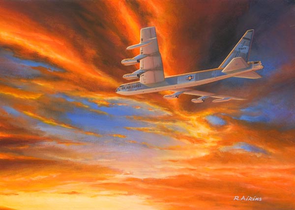 The B-52D, as shown in this painting, was produced in the largest numbers of any of the many versions. It was first planned to retire this and older models in 1971. After serving in Southeast Asia, the B-52D’s were kept on and in late 1972 over 200 aircraft, including newer B-52G’s, were bombing Hanoi. The B-52H, the only surviving version, continues to fly bombing missions in the Persian Gulf.
