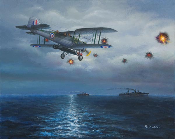 This painting illustrates a “Stringbag” flying into enemy anti-aircraft flak as it is about to launch a torpedo attack on a enemy warship.
